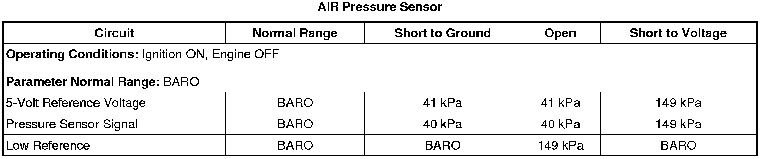 1. Ignition ON, engine OFF, verify that the AIR Press. Sen. Bn. 2 parameter is within 3 kPa of the BARO parameter.