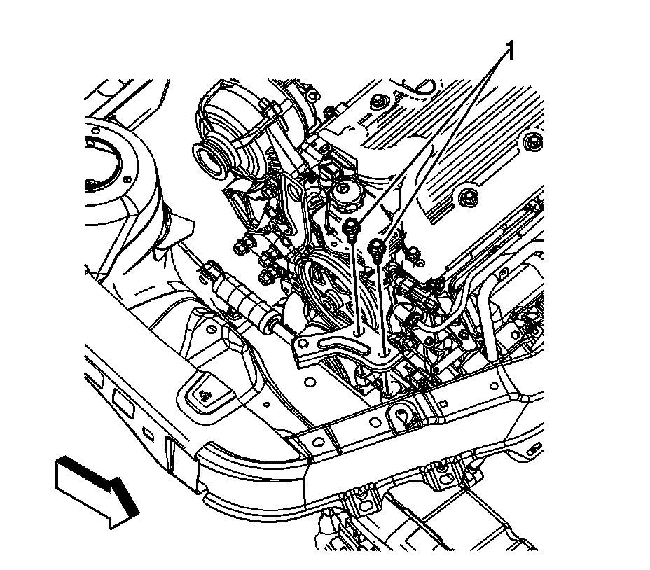2. Remove the engine mount snubber to engine mount snubber bracket bolts (1).