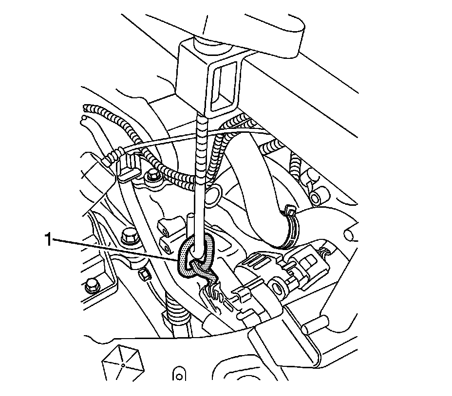 16. Adjust the radiator shelf tube J 28467-2A and the assemblage lift hook bracket J 28467-6A in order to align the hook with the left (front), rear of engine, lift hook bracket part of the left engine mount strut bracket.