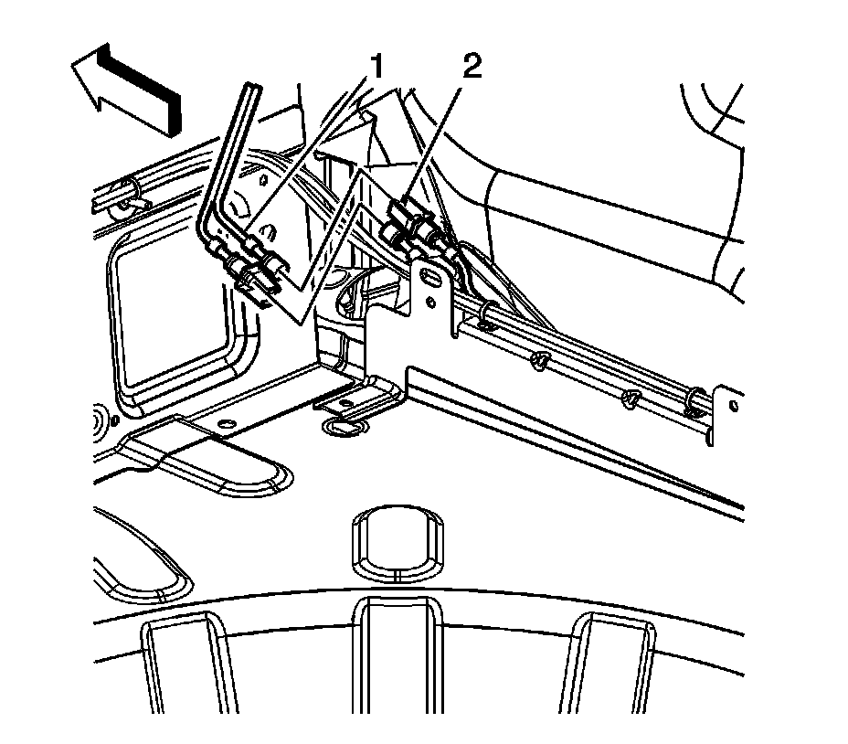 10. Remove the bolts (1) from the left and right of the side rail link (2). Refer to Folding Top Side Rail Link Replacement (Folding Top Side Rail Link Replacement).