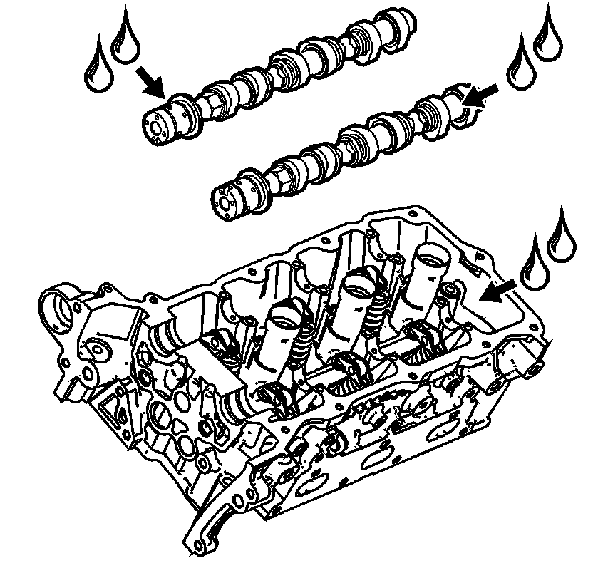 2. Apply a liberal amount of lubricant GM P/N 12345501 (Canadian P/N 992704) or equivalent to the camshaft journals and the left cylinder head camshaft carriers.