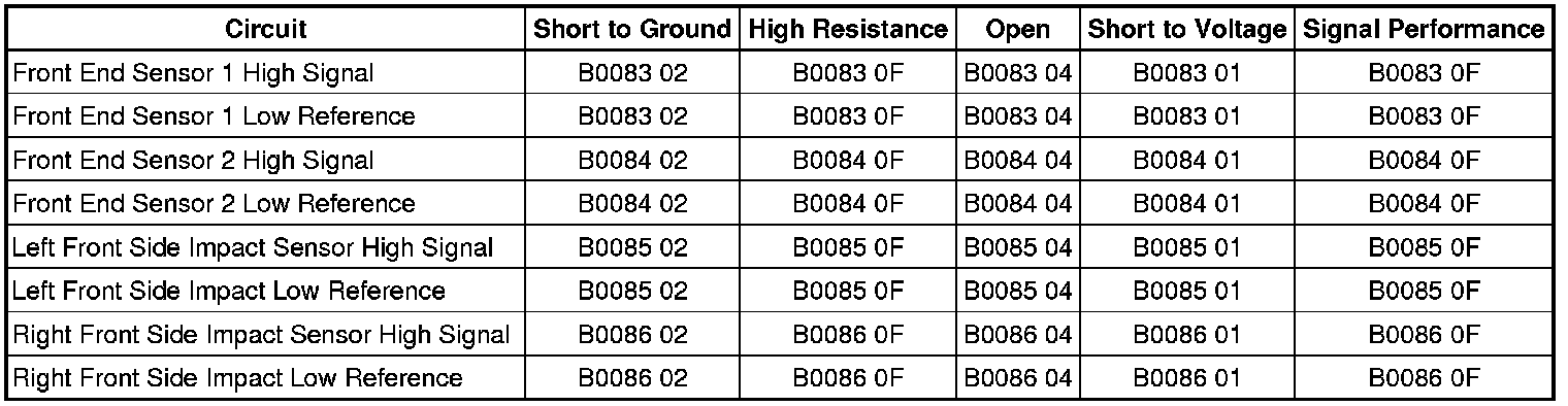 The inflatable restraint front end sensor also known as the electronic frontal sensor (EFS) utilizes a unidirectional 2-wire circuit. The front end sensor modulates current on the interface to send ID, state of health, and deployment commands to the inflatable restraint sensing and diagnostic module (SDM). The SDM serves as a power source and a ground for the front end sensor. When the ignition is turned on and input power from the SDM is first detected, the front end sensor responds by performing internal diagnostics and sending an ID to the SDM. The SDM considers the ID to be valid if the response time is less than 5 seconds. The front end sensor continually communicates status messages to the SDM, which determines if a fault is present in the front end sensor circuit. When a fault is detected, the SDM may reset the front end sensor up to 2 times by removing and reapplying power to it. If the fault is still present, the SDM will set a diagnostic trouble code (DTC).