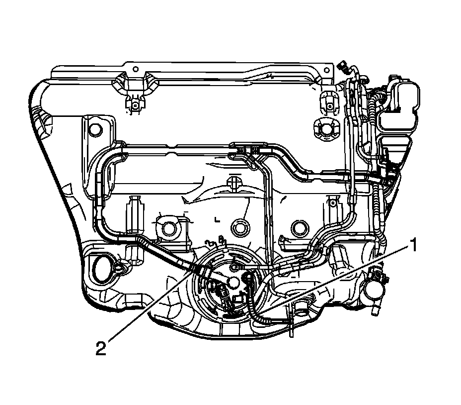 3. Disconnect the EVAP vapor line quick connect fittings (1, 2). Refer to Plastic Collar Quick Connect Fitting Service (Plastic Collar Quick Connect Fitting Service).