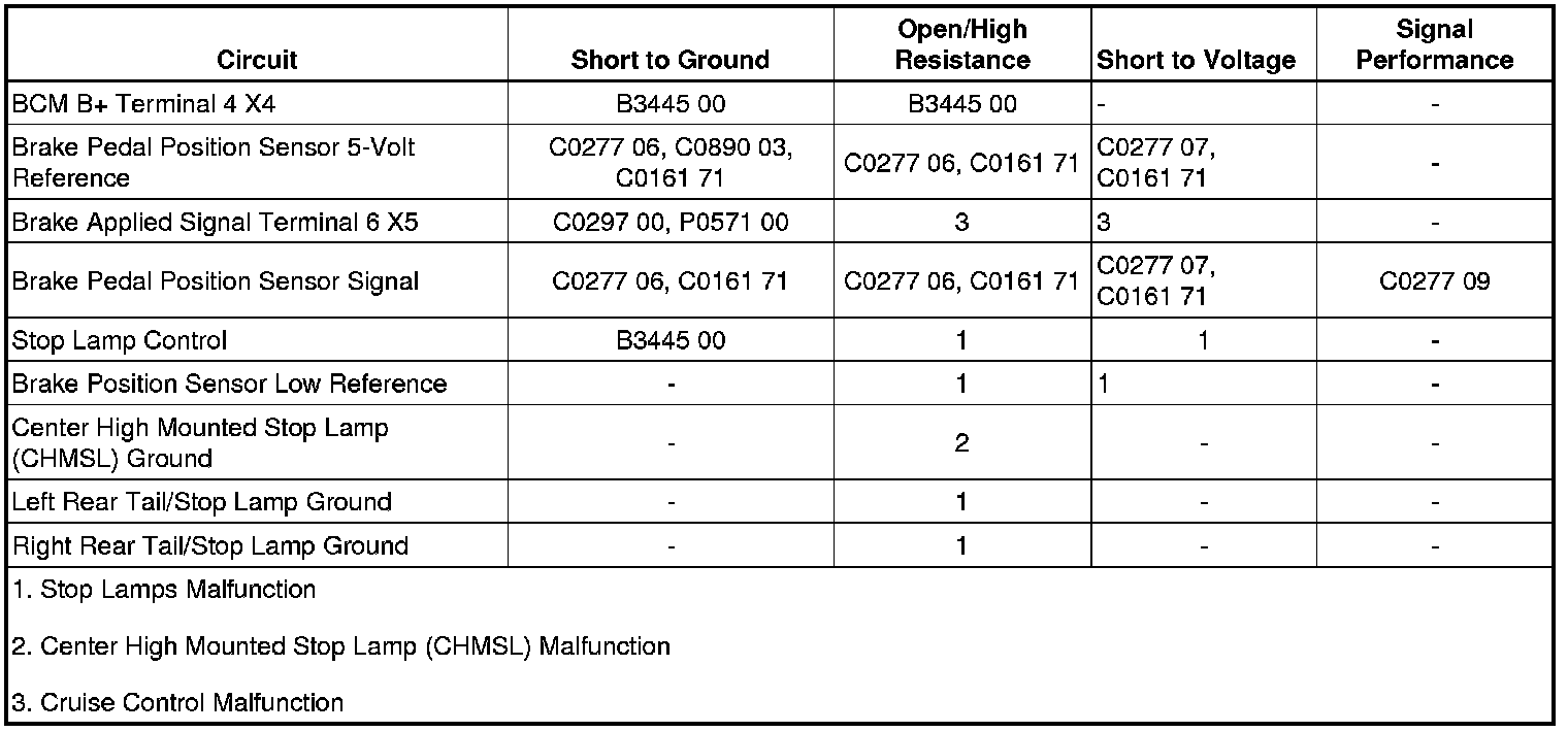 The brake pedal position sensor is used to sense the action of the driver application of the brake pedal. The brake pedal position sensor provides an analog voltage signal that will increase as the brake pedal is applied. The body control module (BCM) provides a low reference signal and a 5-volt reference voltage to the brake pedal position sensor. When the variable signal reaches a voltage threshold indicating the brakes have been applied, the BCM will apply battery voltage to the stop lamp control circuit illuminating the left and right stop lamps and the center high mounted stop lamp (CHMSL). The BCM also applies battery voltage to the transmission control module (TCM) and engine control module (ECM) via the brake applied signal circuit.