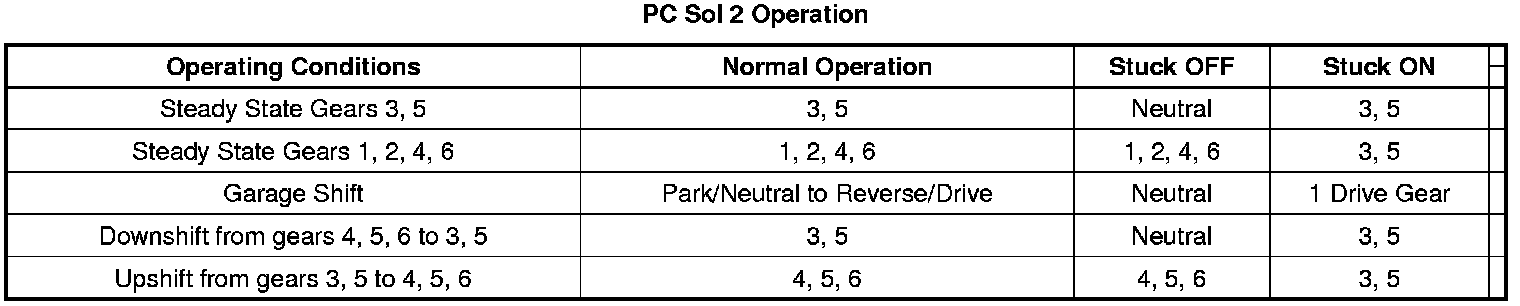 The clutch pressure control (PC) solenoid 2 is part of the control solenoid (w/body and TCM) valve assembly and is not serviced separately. The clutch PC solenoid 2 flows fluid to the 3-5-R clutch when commanded OFF and exhausts fluid when commanded ON. The clutch PC solenoid 2 regulates the transmission fluid pressure to the 3-5-R clutch. The TCM calculates gear ratio based on data from the automatic transmission input speed sensor (ISS) and the output speed sensor (OSS). The TCM compares the known transmission gear ratio to a calculated gear ratio for each commanded gear.