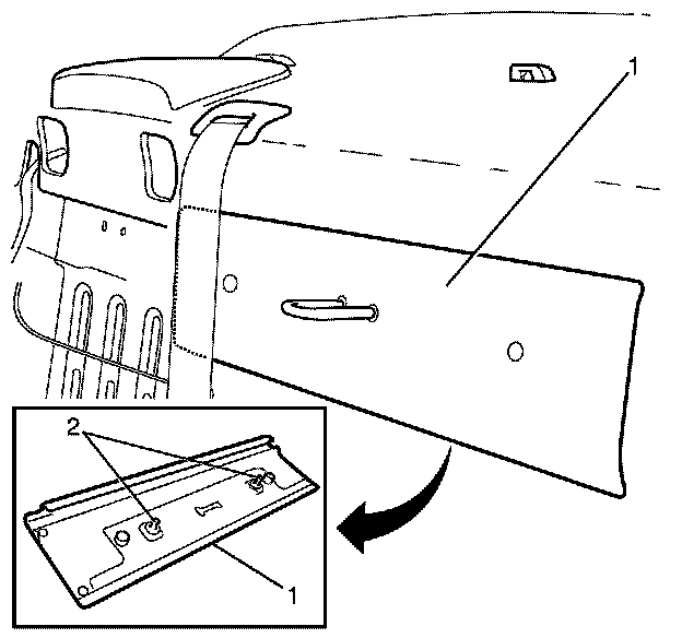5. Align the clips 2 and install the rear lock striker trim panel (1) to the vehicle. Listen for an audible click to confirm correct fitment of the rear lock striker trim panel (1).