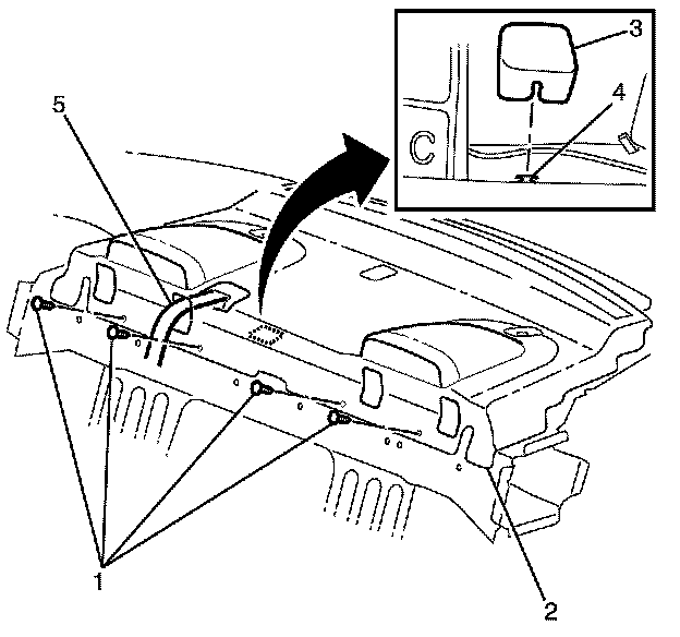 11. Slide the centre seat belt (5) through the centre seat belt slot and remove the rear window shelf trim panel (2) from the vehicle.