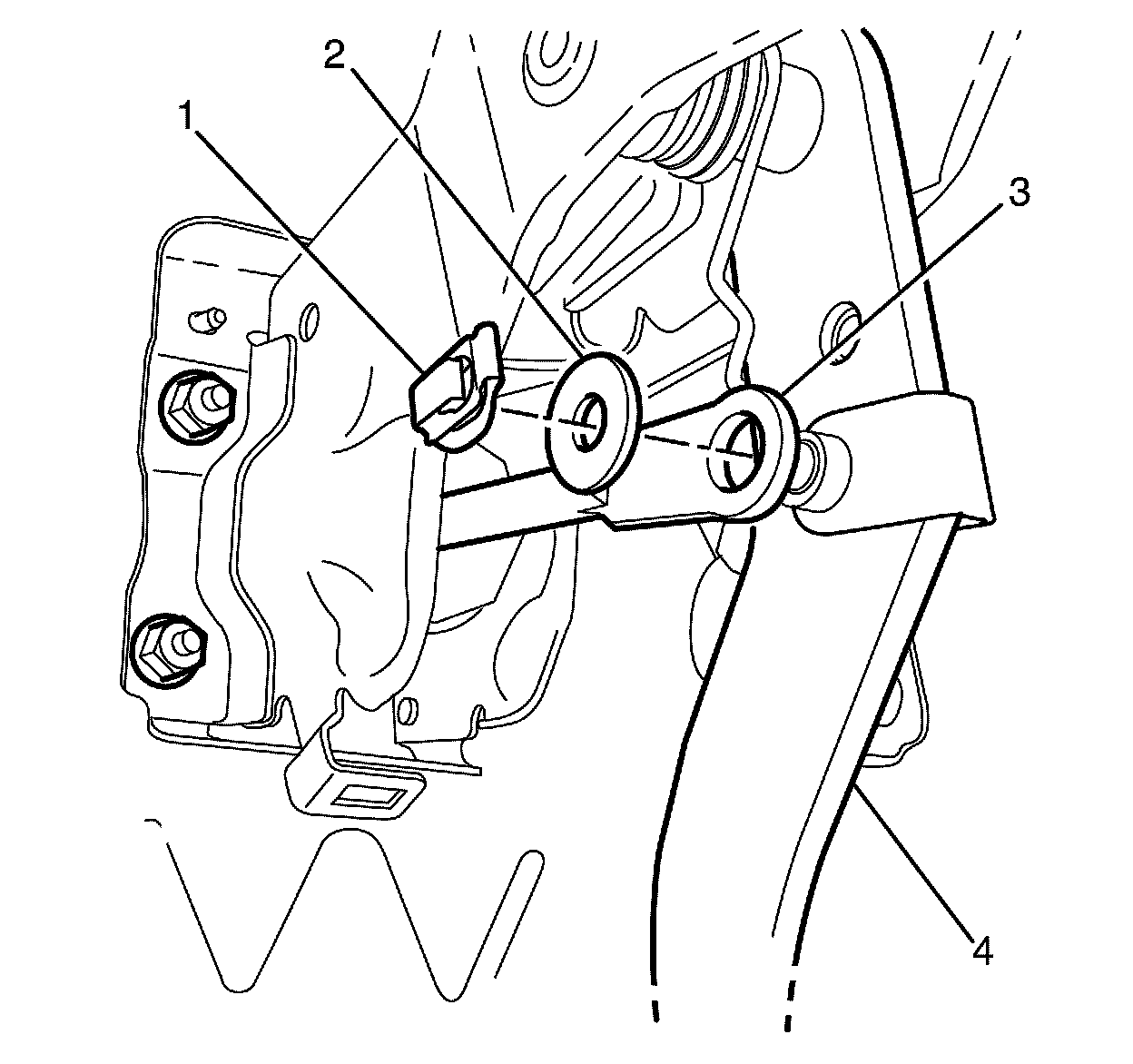 4. Install the push rod (3), washer (2) and retaining clip (1) to the brake pedal assembly (4).