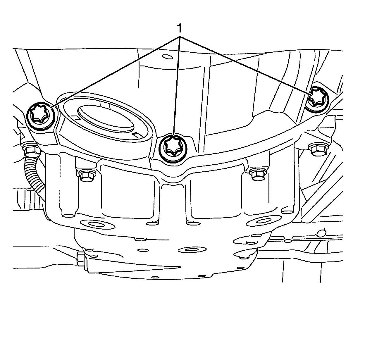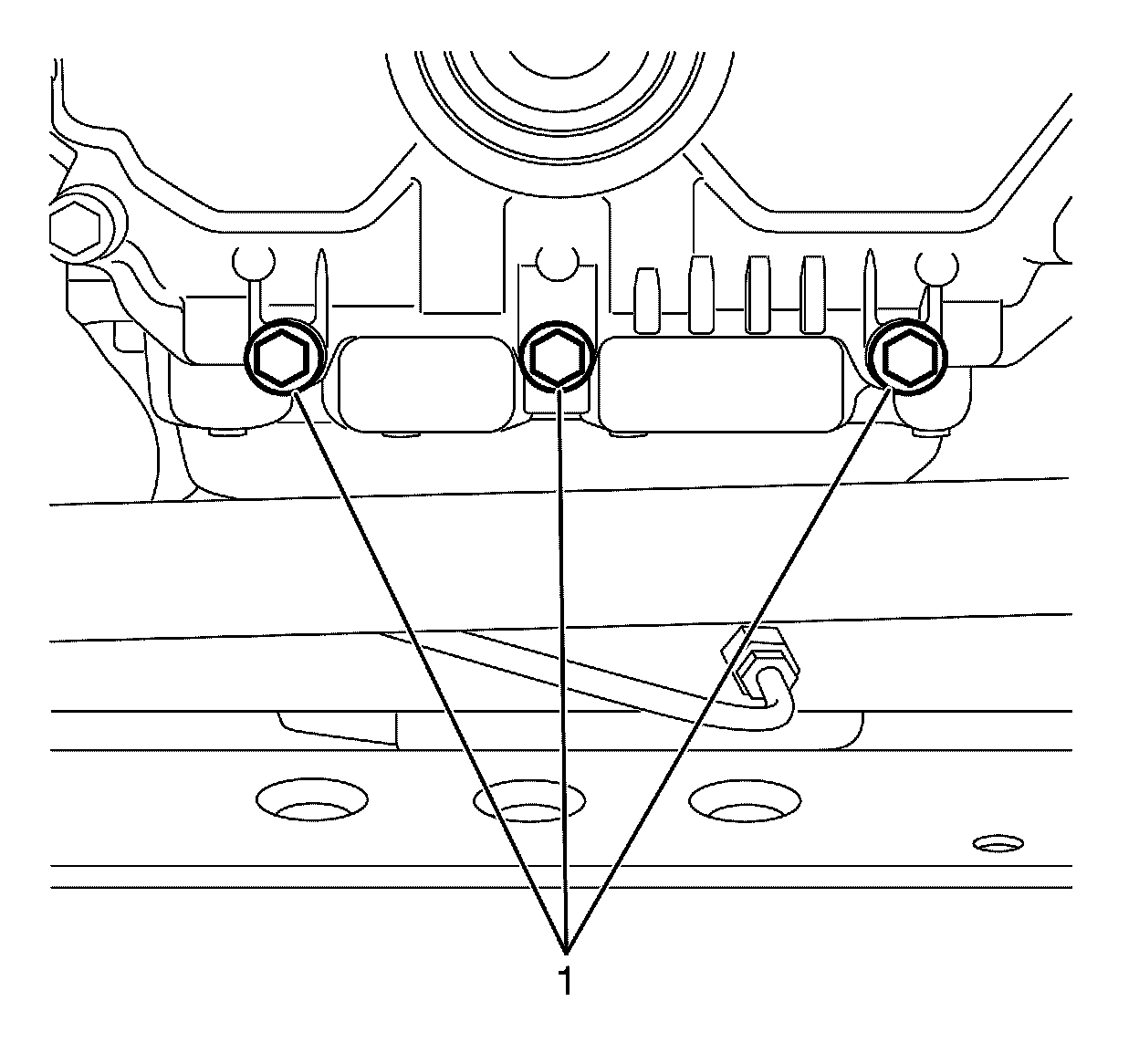 5. Install the transmission to the oil pan retaining bolts (1) and tighten to 48 Nm (17 lb ft).