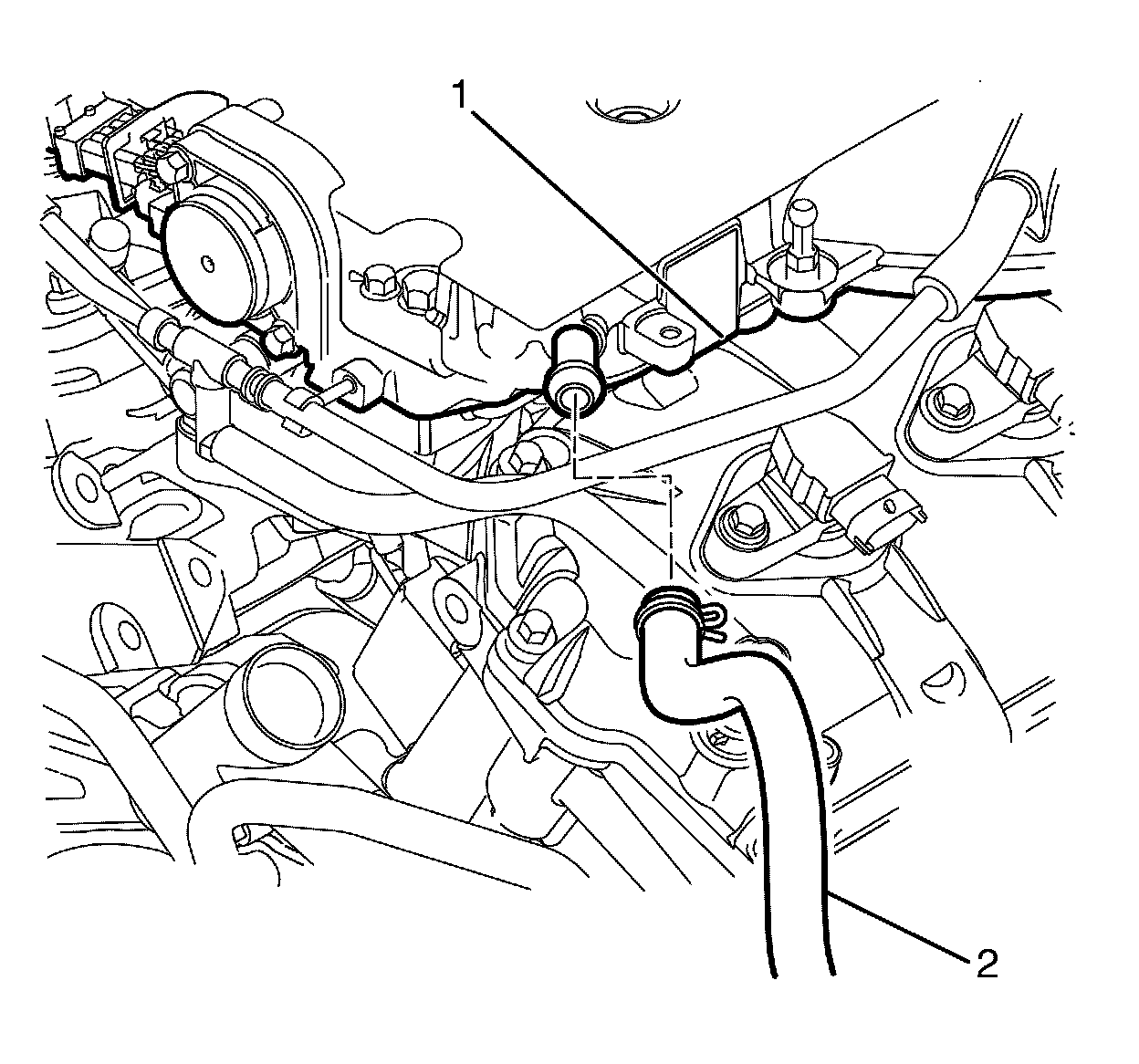 6. Connect the EVAP line (1) to the intake manifold (2).