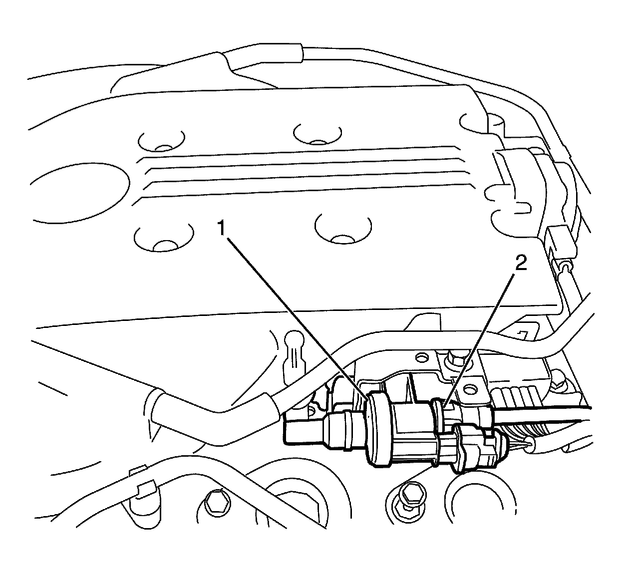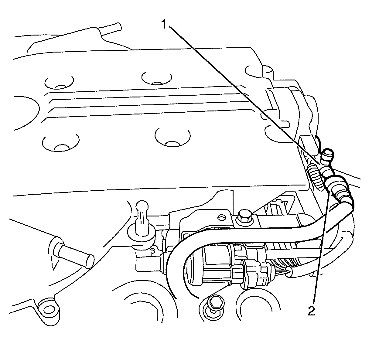 15. Plug or cap the fuel feed pipe (2) and fuel rail (1) ends.