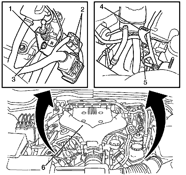 8. Remove the upper intake manifold sight shield bracket (4) from the engine assembly (6).