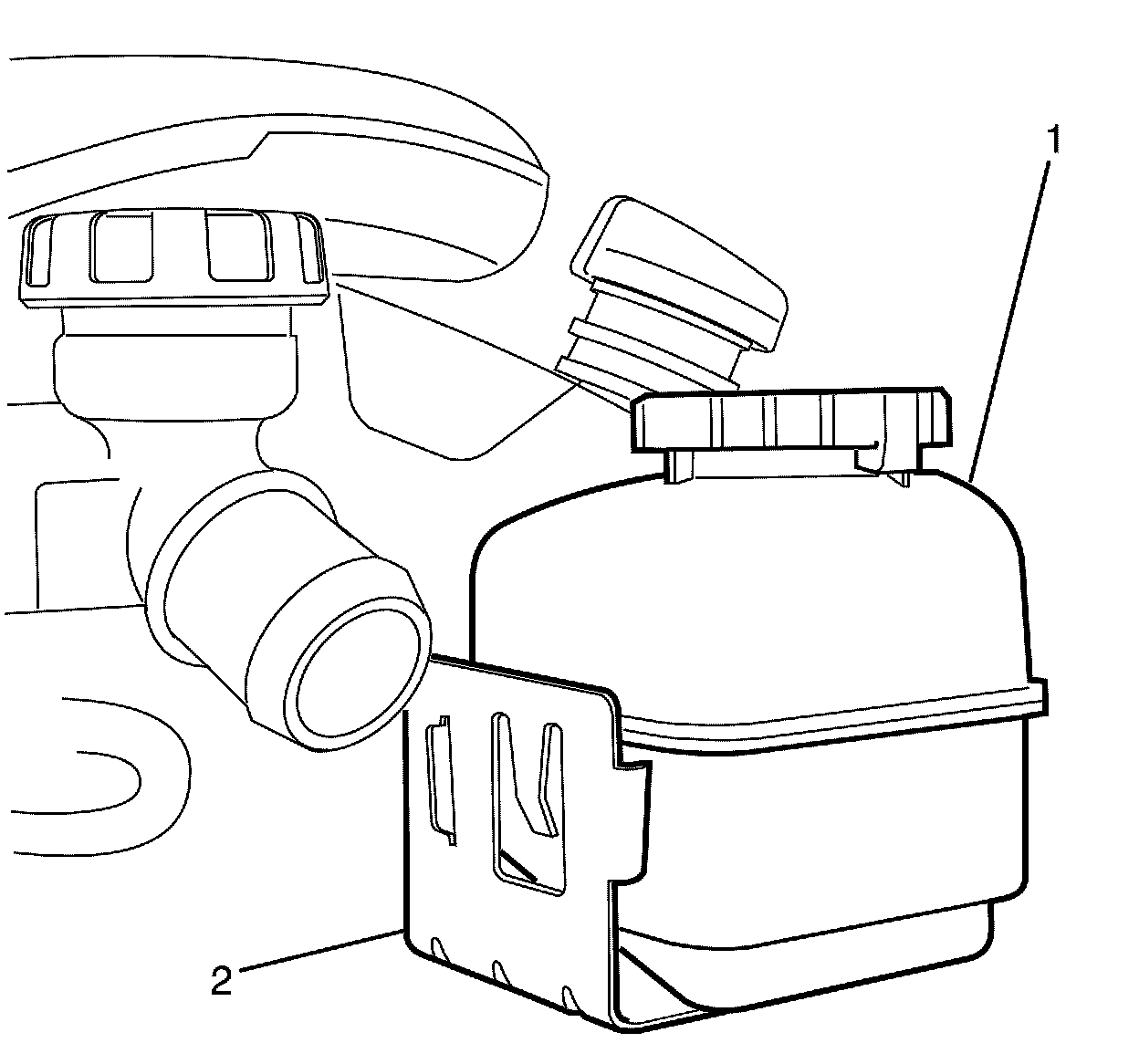 Important: The locking tang on the power steering reservoir bracket (2) must be released before removing the power steering reservoir (1). Release the locking tang on the power steering reservoir bracket (2) with a suitable tool.