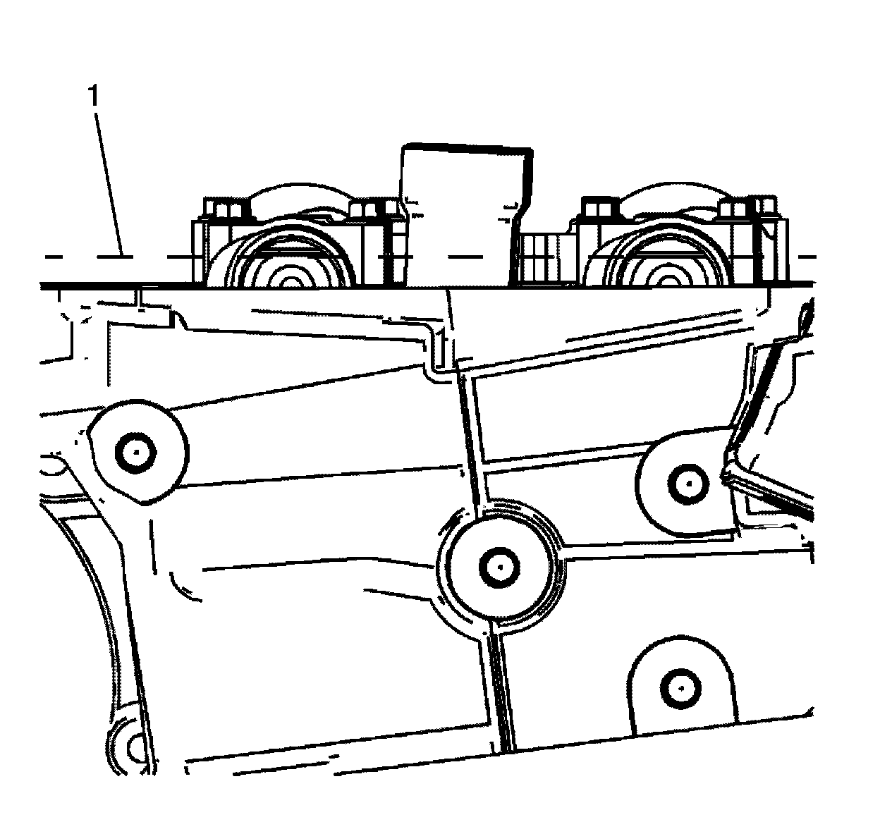 6. Position the camshaft lobes in a neutral position with the flats on the back of the camshafts up and parallel (1) with the left cylinder head camshaft cover rail.