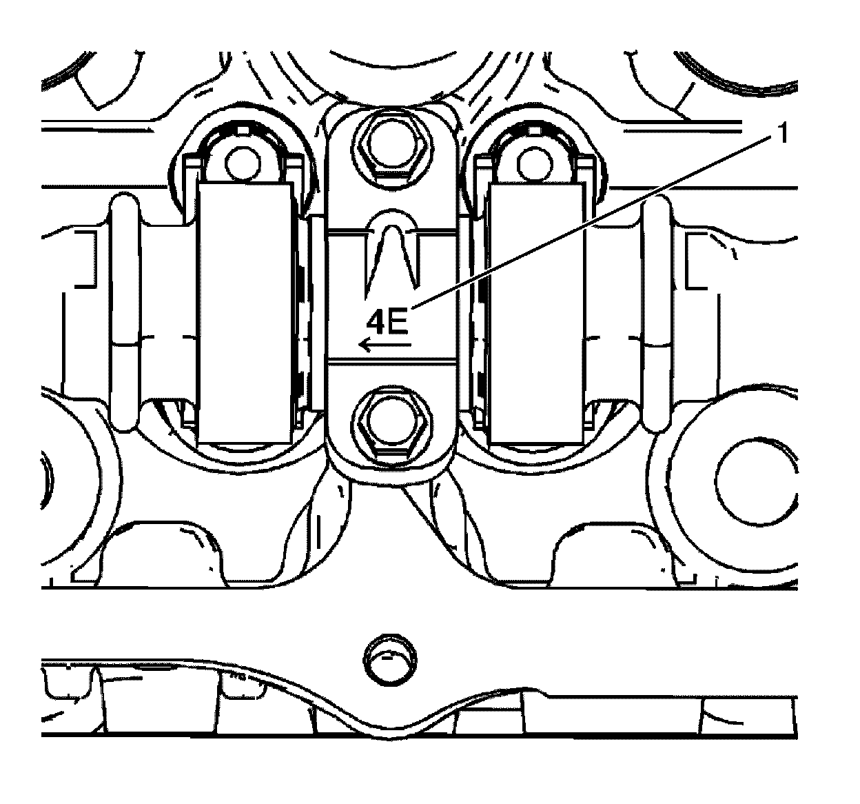 14. Retighten the center camshaft bearing cap to cylinder head retaining bolts (1, 2, 3, 4) to 10 Nm (89 lb in).