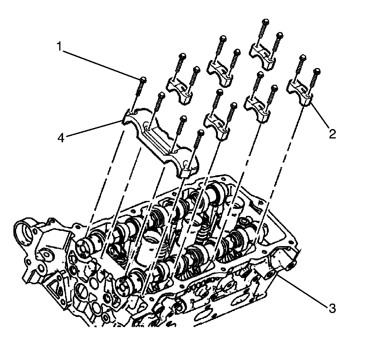 10. Install the remaining bearing caps (2) with their orientation mark toward the center of the cylinder head (3).