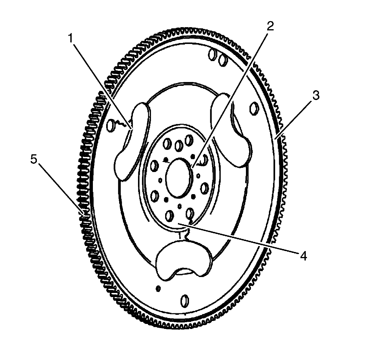 * Stress cracks around the engine flywheel-to-torque converter mounting bolt hole locations (1) and/or engine flywheel-to-crankshaft (2 and 4)