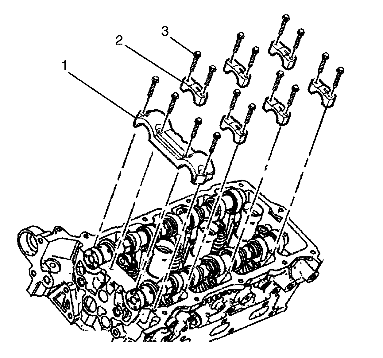 4. Remove the camshaft bearing cap to cylinder head retaining bolts (3).