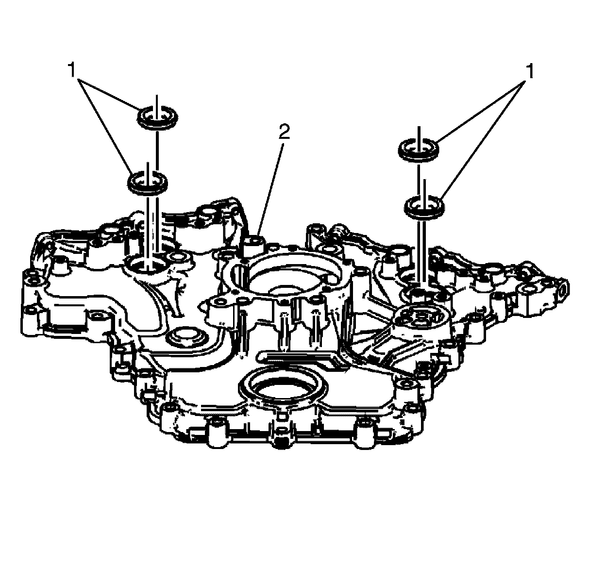 Important: The camshaft position actuator solenoid valve oil seals (1) must be discarded whenever the camshaft position actuator solenoids have been removed from the front cover (2).