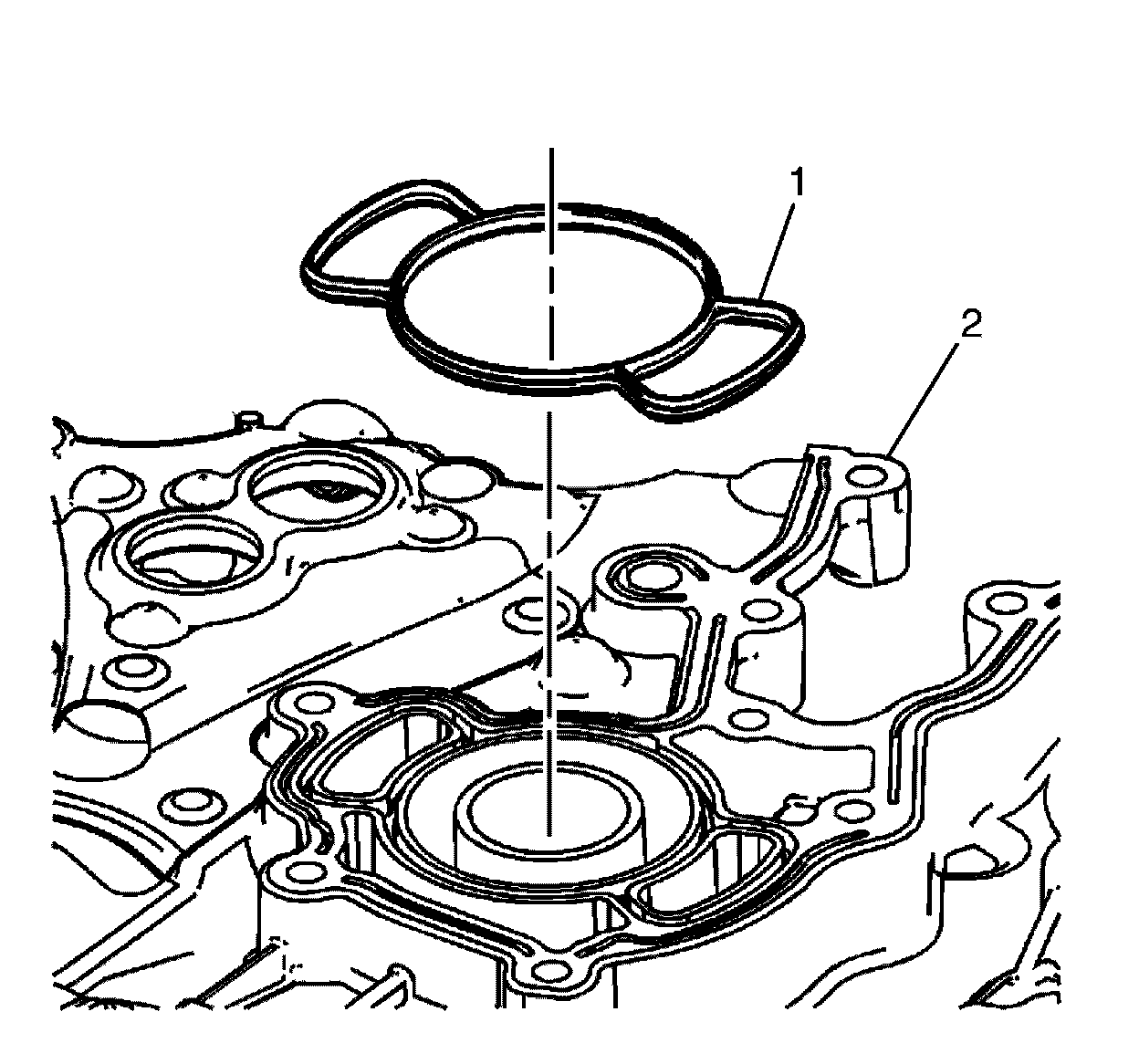 Important: The water pump seal (1) must be discarded whenever the water pump has been removed from the front cover (2).