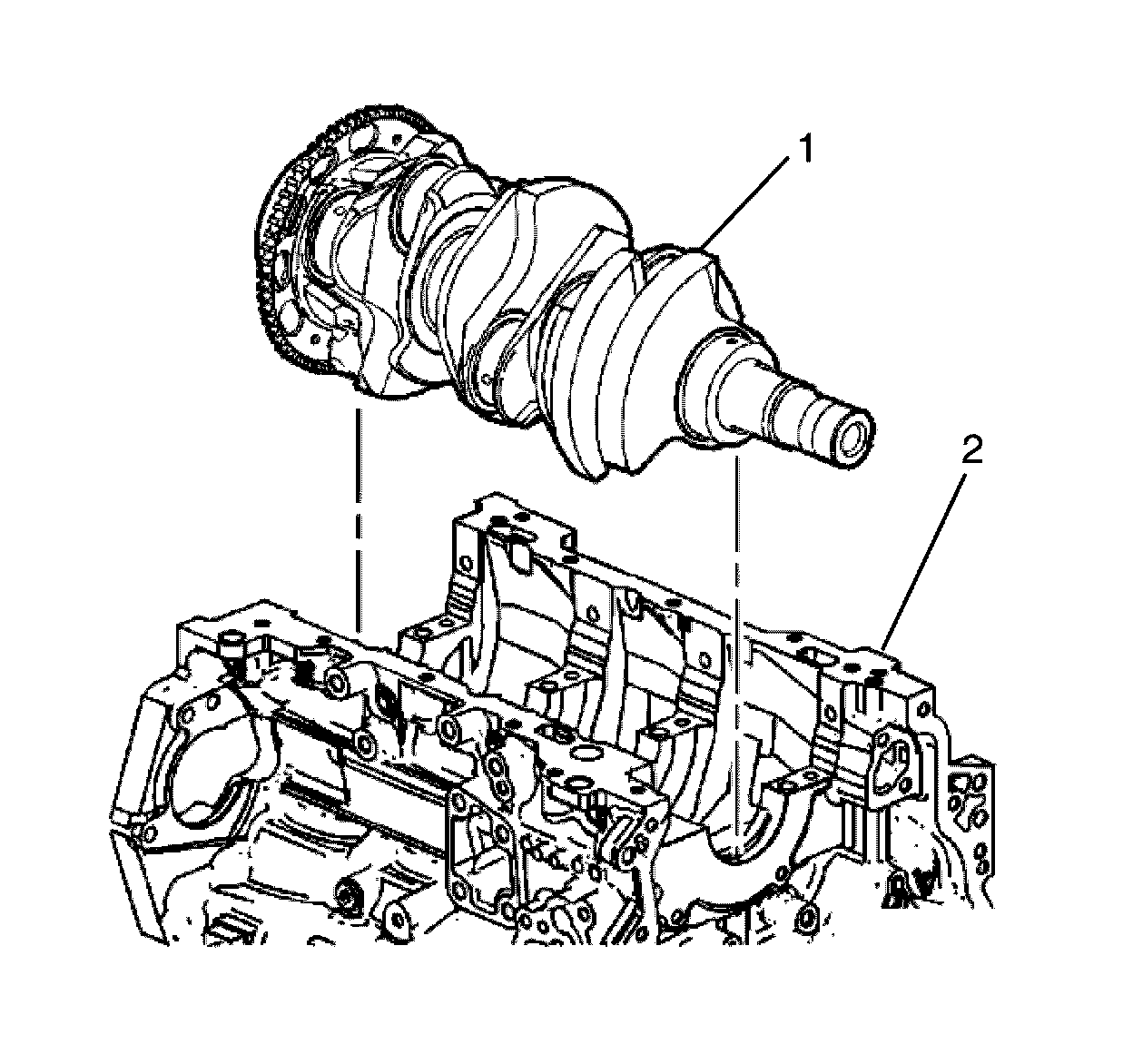 2. Gently lower the crankshaft (1) into position in the cylinder block (2).