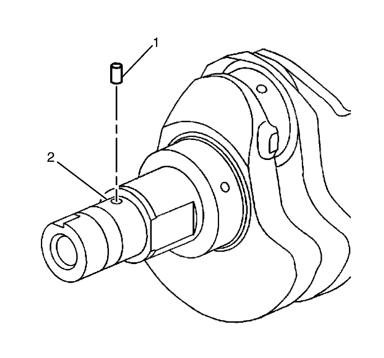 1. If removed, install the crankshaft sprocket drive pin (1). Lightly tap the crankshaft sprocket drive pin (1) in place with a small soft face, bronze/plastic, hammer until it bottoms in the hole of the crankshaft (2).