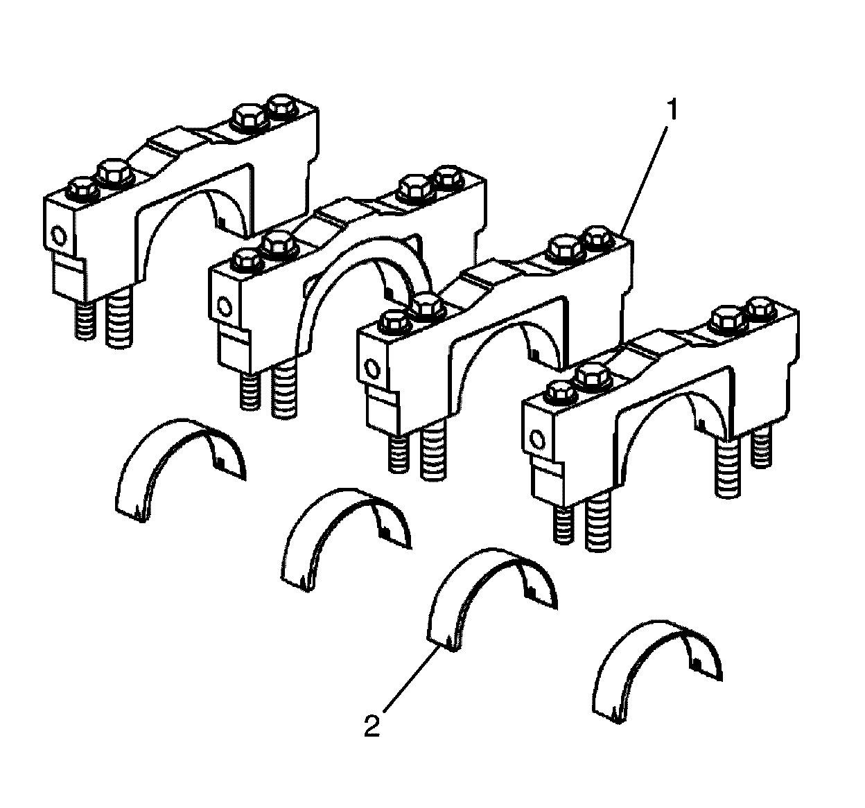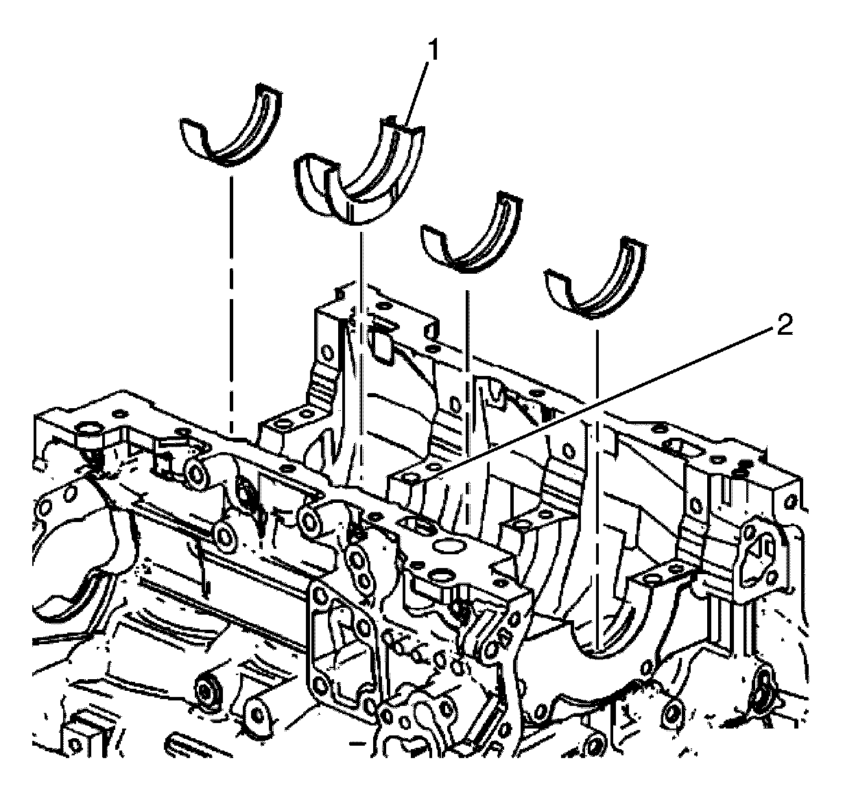 4. Install the new lower crankshaft bearings (2) into position in the crankshaft bearing caps (1). The lower crankshaft bearings (2) are identified by NO grooves or holes. The lower crankshaft bearings (2) must fit flush with the crankshaft bearing caps (1).