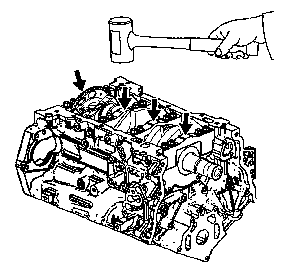 6. Tap the crankshaft bearing caps with a soft-faced hammer to help seat the crankshaft bearing caps.