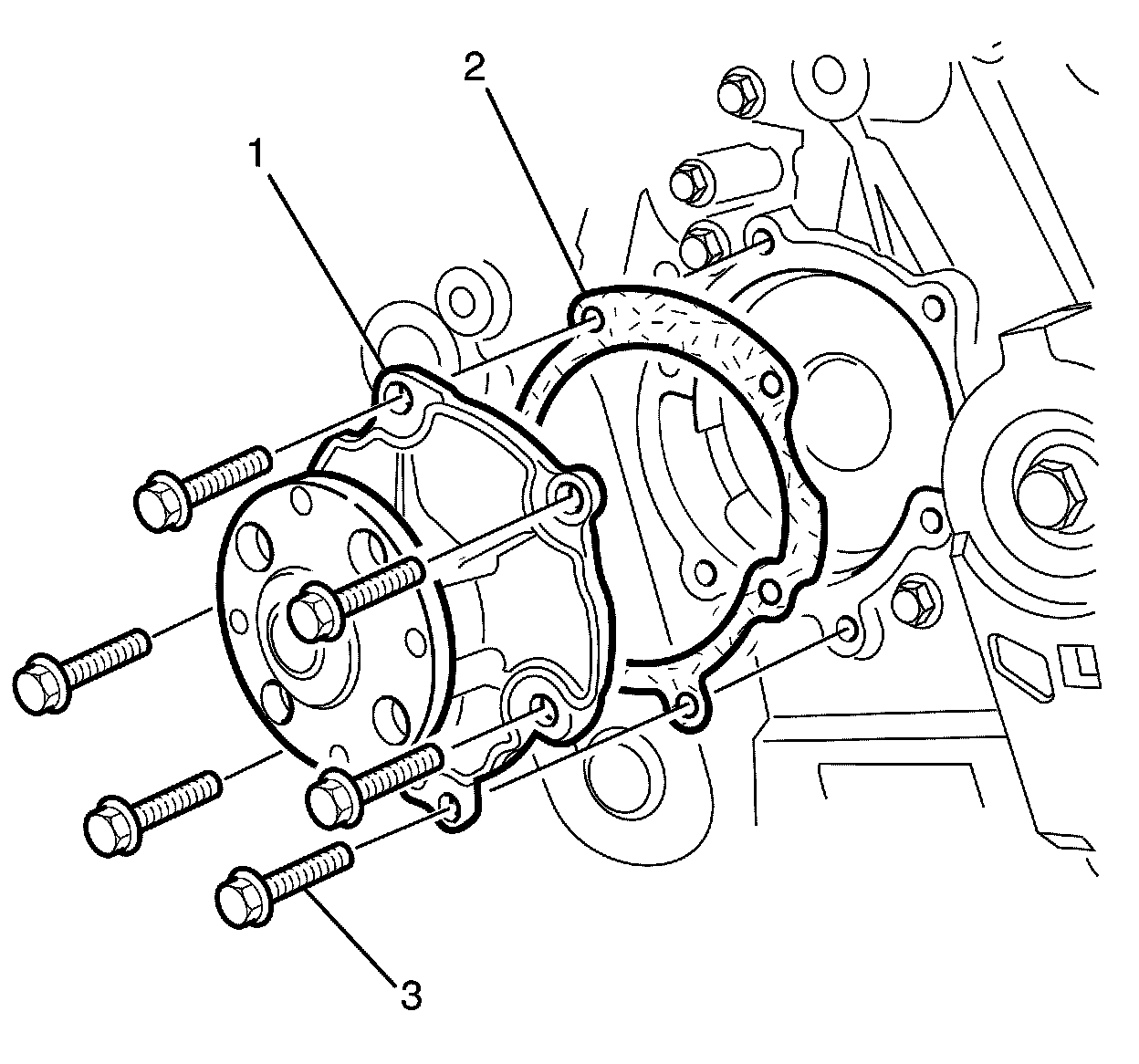 10. Remove the water pump to engine front cover retaining bolts (3).