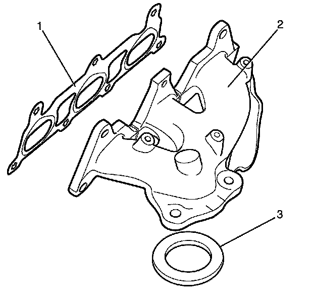 2. Install a NEW exhaust manifold gasket (1) and NEW sealing ring (3) to the exhaust manifold (2).