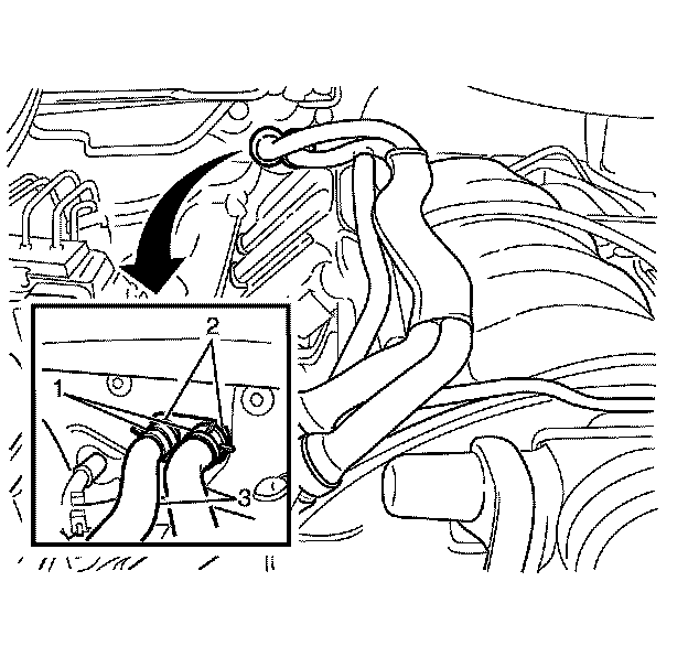 3. Using J 38185 compress the heater hose retaining clamps (1) and slide 50 mm (2 in) along the heater hose (3).