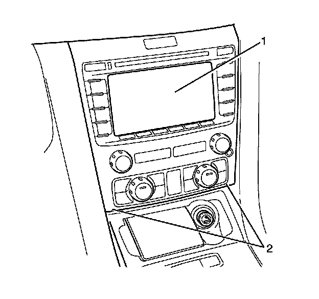 1. Grasp the bottom of the infotainment fascia (1) with both hands at point (2) and pull away from the instrument panel, disconnecting the fascia retainers.