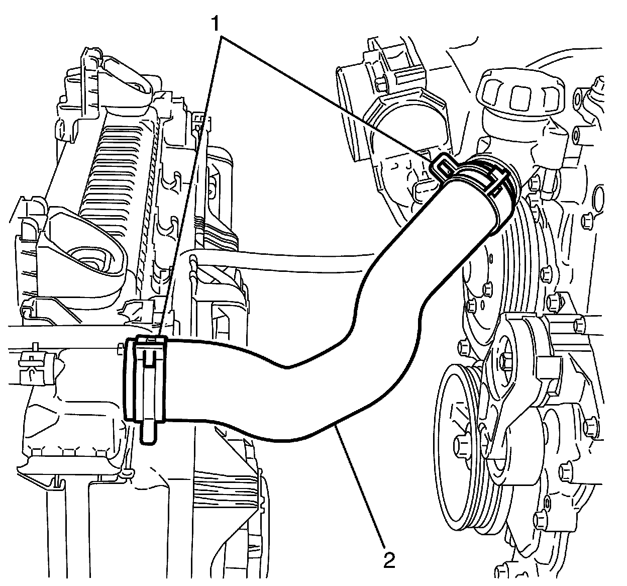 7. Remove the retaining hose clamps (1) back on the inlet hose (2) at both ends.