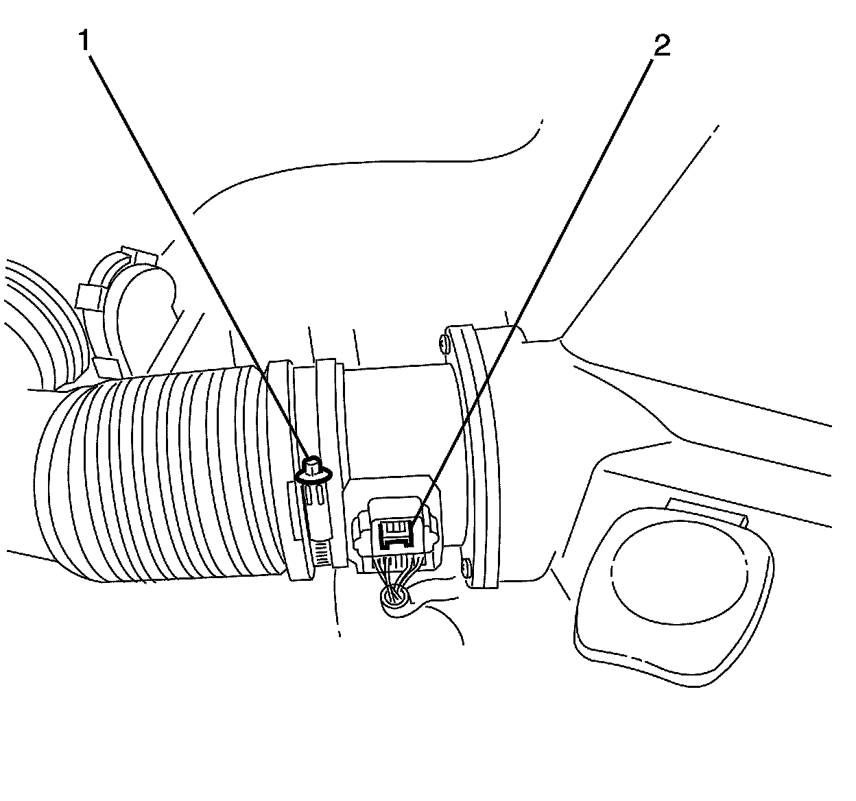 3. Remove the mass air flow (MAF) harness connector (2) from the MAF sensor.