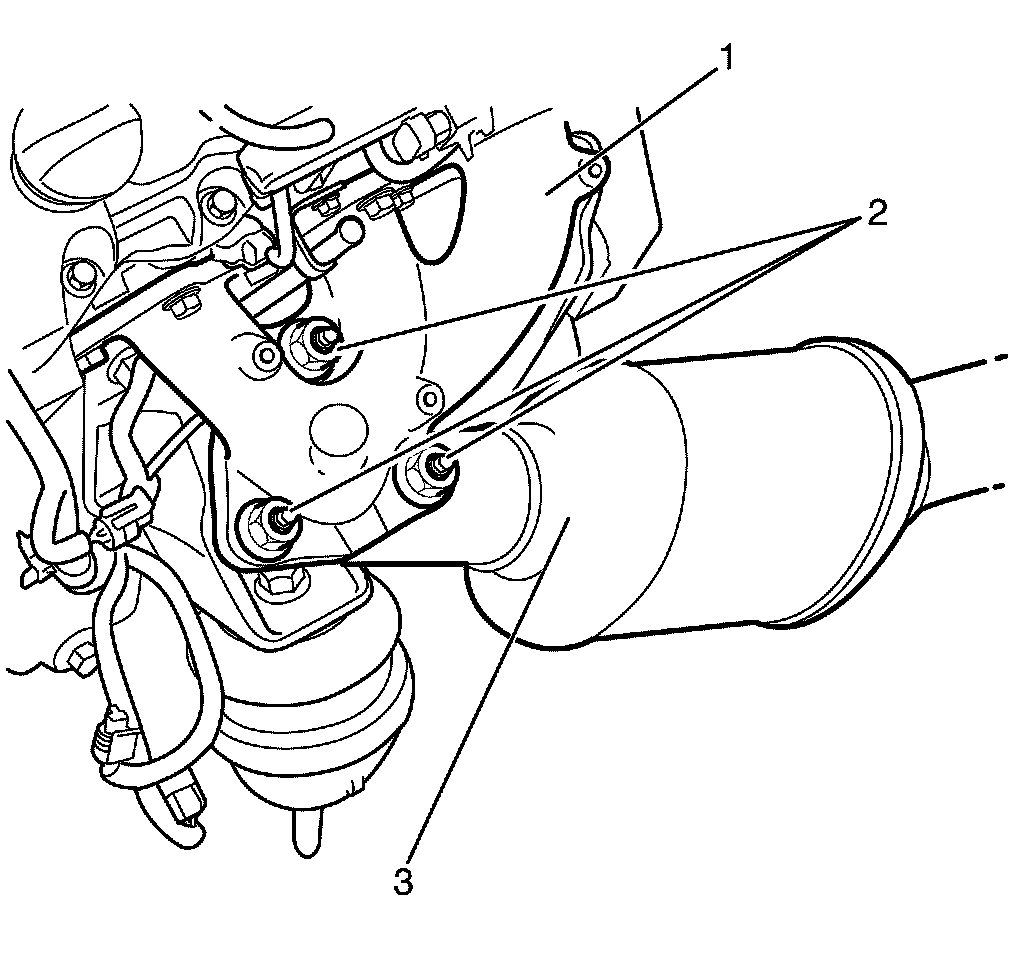 10. Pull down and back on the left catalytic converter (3) to disconnect from the exhaust manifold (1).