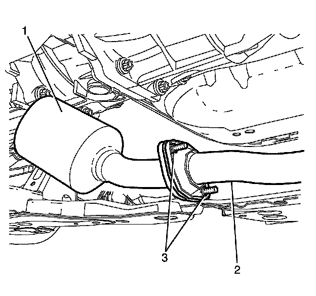 8. Remove the exhaust crossover pipe assembly to right catalytic converter retaining nuts (3).