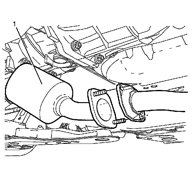 9. Pull down and back on the right catalytic converter (1) to disconnect from the exhaust manifold.