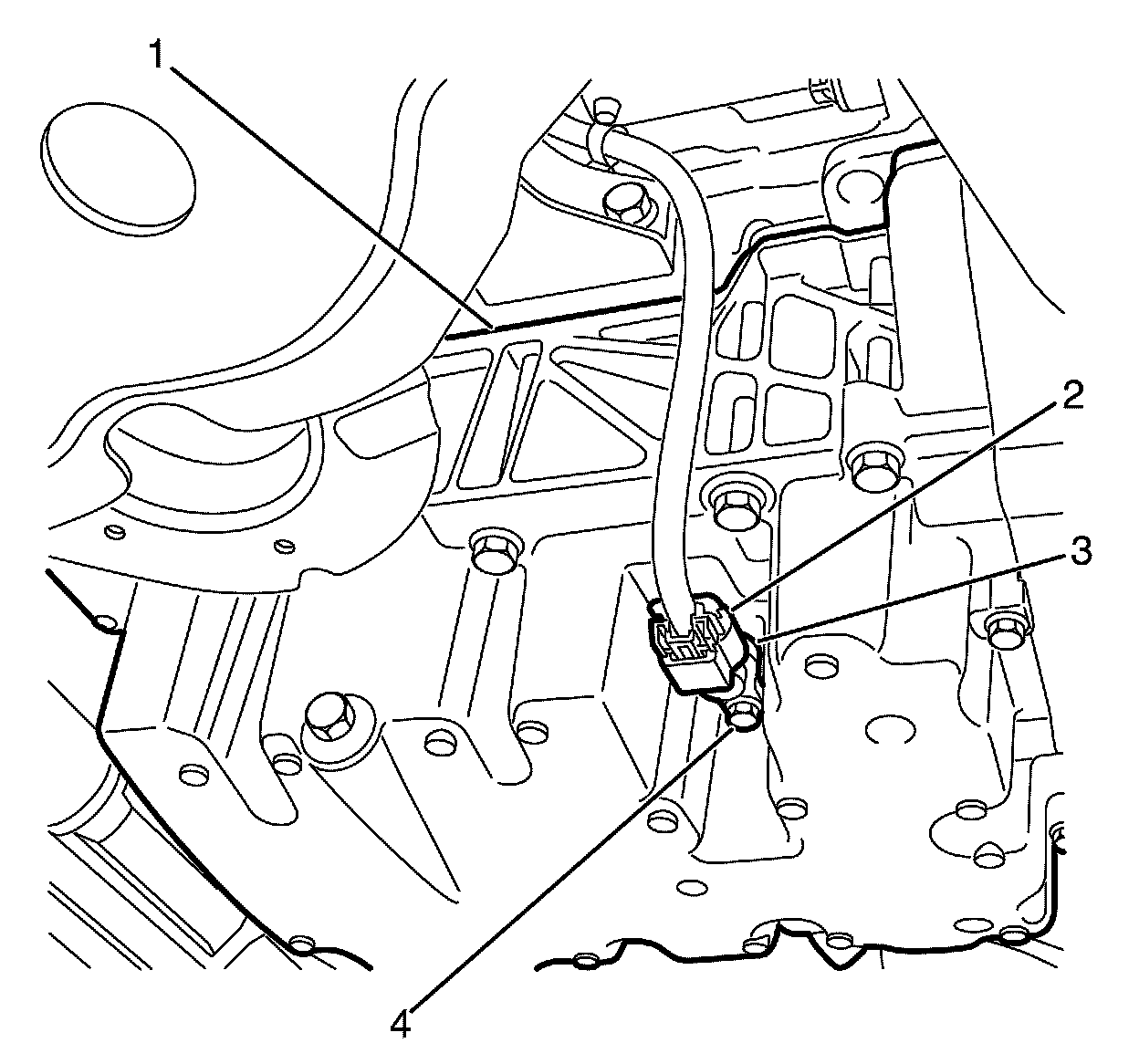 5. Remove the engine oil level switch to oil pan retaining bolt (4).