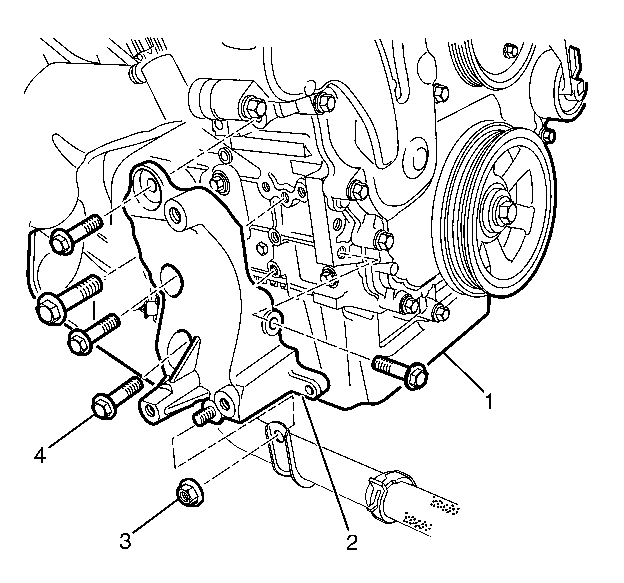 4. Remove the alternator mounting bracket (2) from the cylinder block (1).