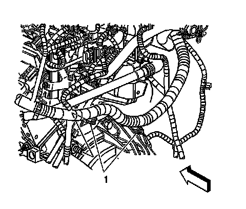 21. Disconnect the engine wiring harness retaining clips (1) to the transmission mounting bolts.