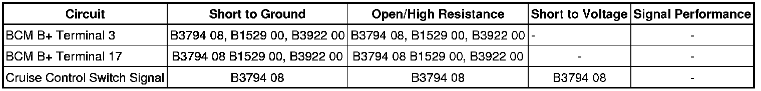 * The BCM detects a short to ground or short to voltage on the cruise control switch signal circuit.