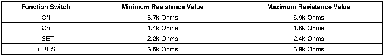 2. Cruise control switch ON, measure the resistance between terminal 5 and terminal 6 while individually activating and holding each cruise control function switch and compare the resistance reading to the values in the table below.