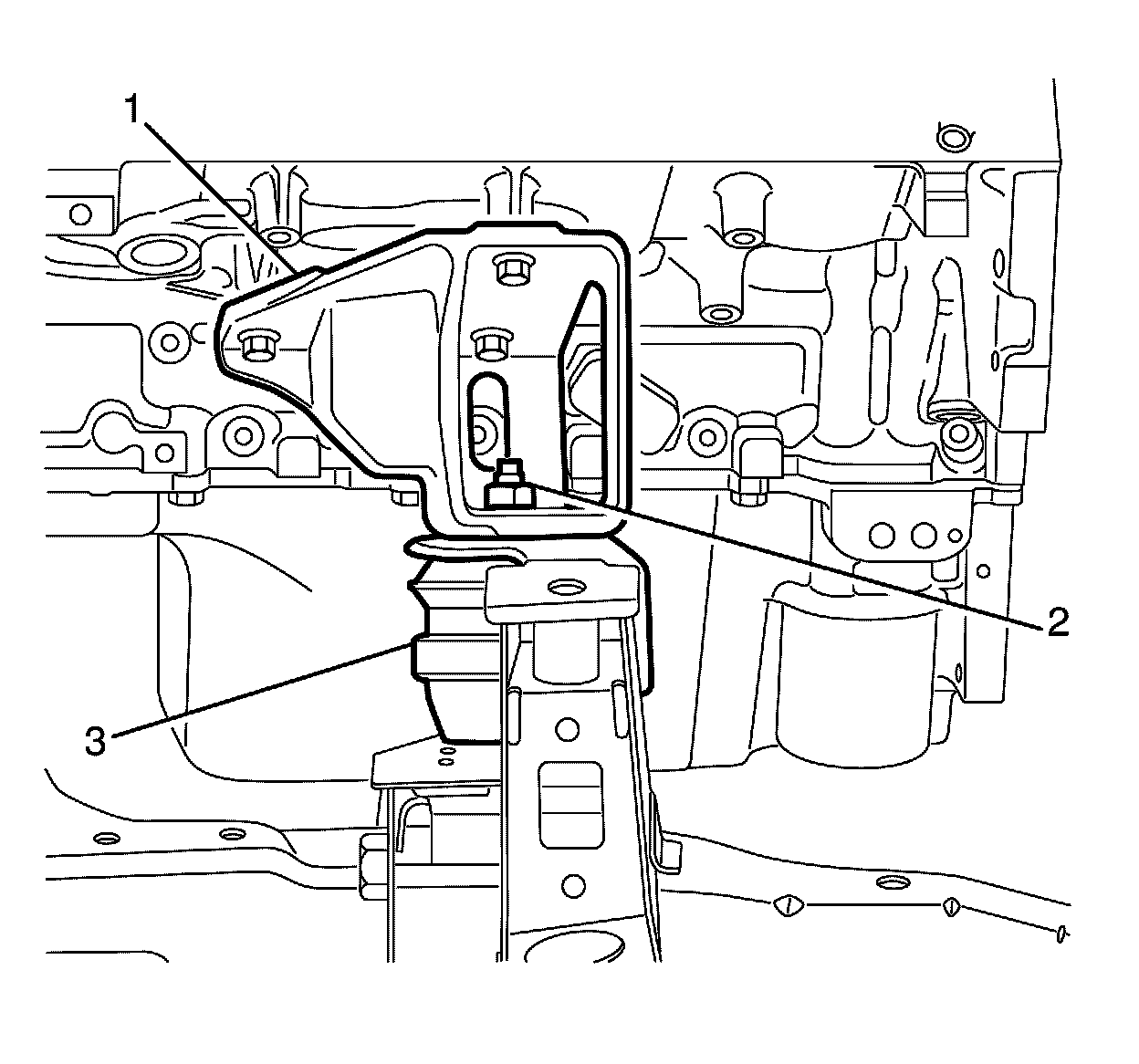 17. Install the steering gear insulator retaining bracket (2) to the steering gear insulator (3).