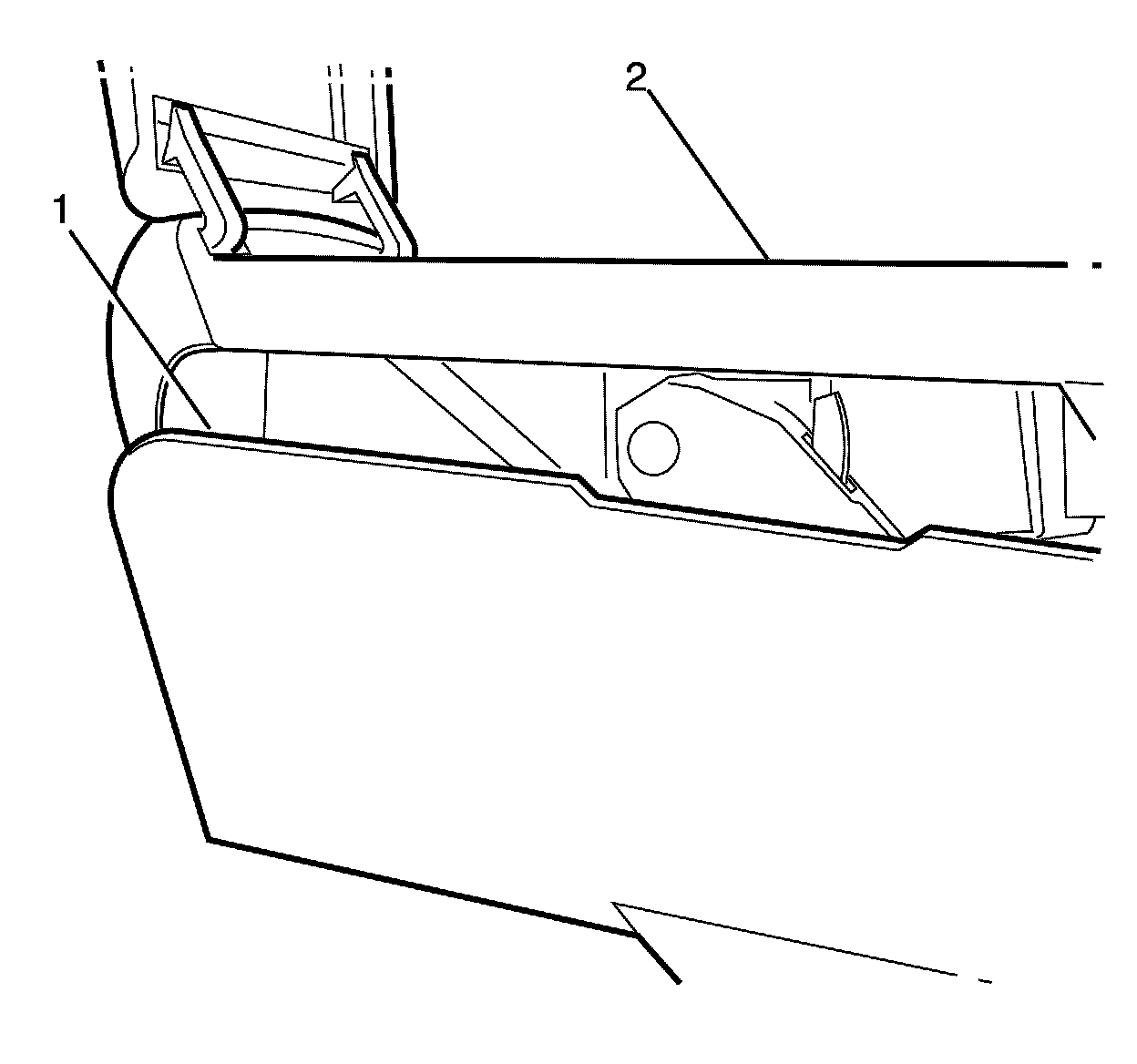2. Detach the rear of the trim plate (1) from the centre console (2) by disengaging the retaining clips.