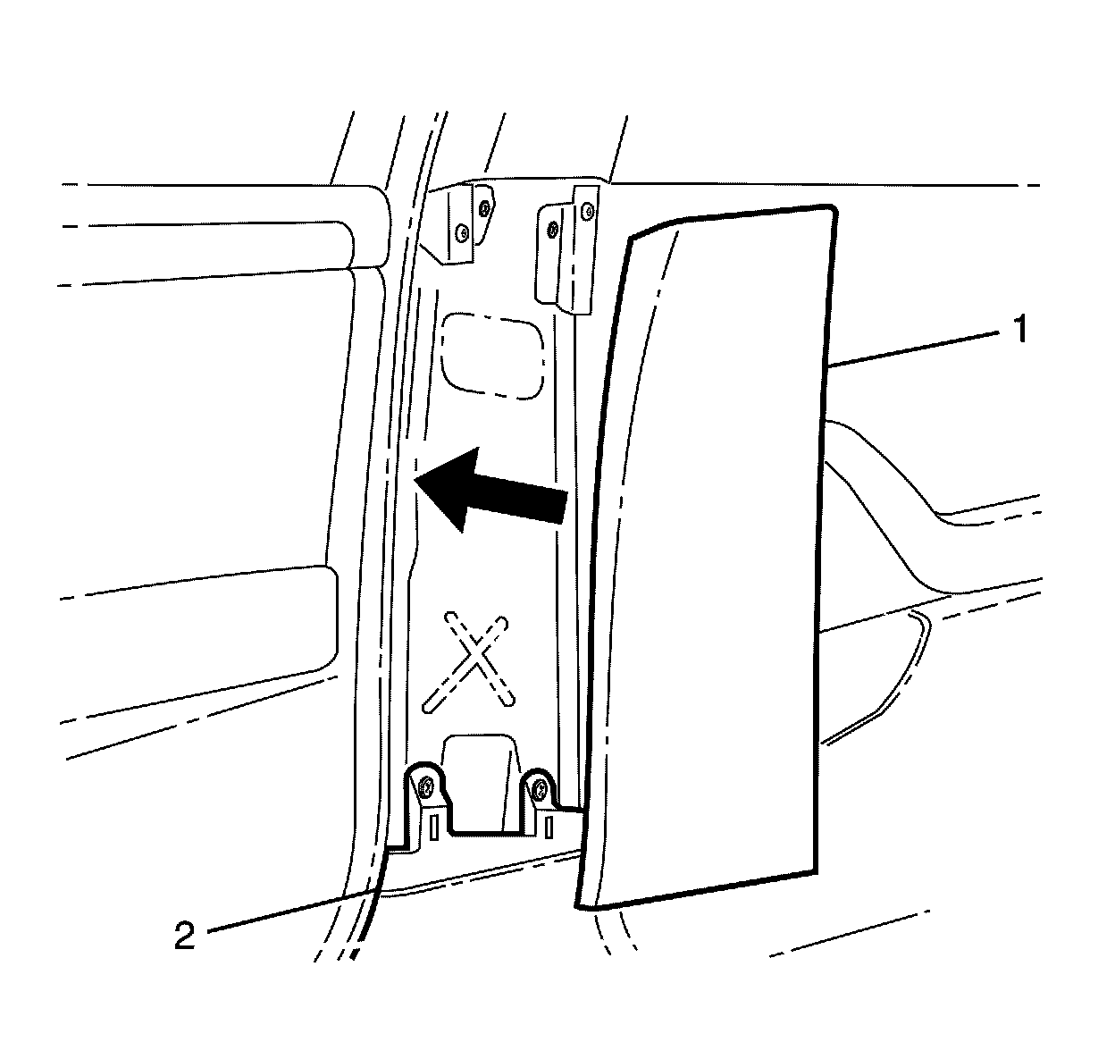 3. Grasp both sides at the top of the trim panel (2) and while spreading, pull away from the door opening, disengaging the trim clip (1).
