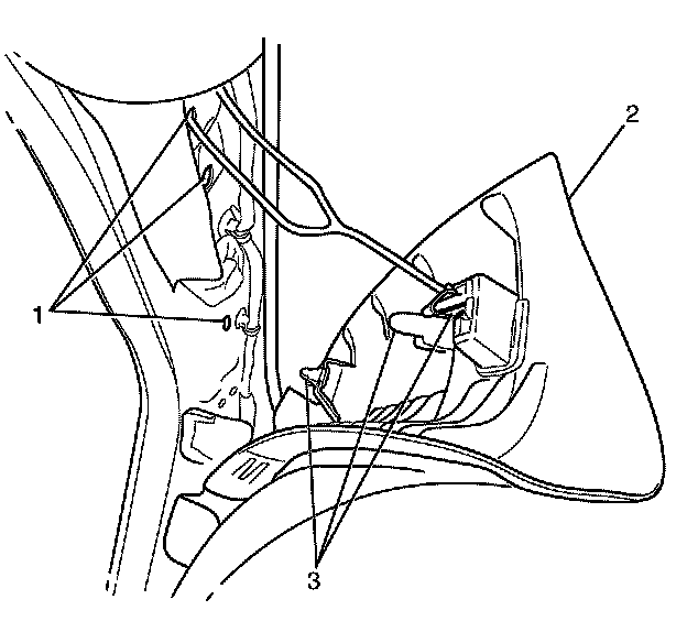 Note: Carefully pull the windshield garnish moulding (2) away from the A pillar body panel (1) to disengage the windshield garnish moulding retaining clips (3) from the A pillar body panel (1).
