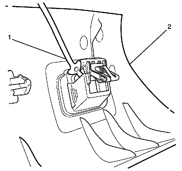 Note: Rotate the windshield garnish moulding to A pillar body panel retaining strap (1) to align the slot in the windshield garnish moulding (2).