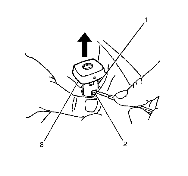 3. Press the head restraint guide retaining lug (2), then remove the guide (3) from the frame.