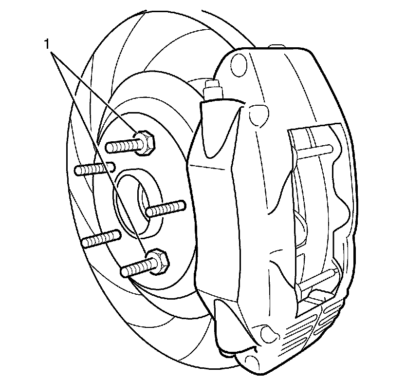 3. Install 2 opposite wheel nuts (1), with the flat side of the wheel nut against the brake rotor to retain the brake rotor to the wheel hub.