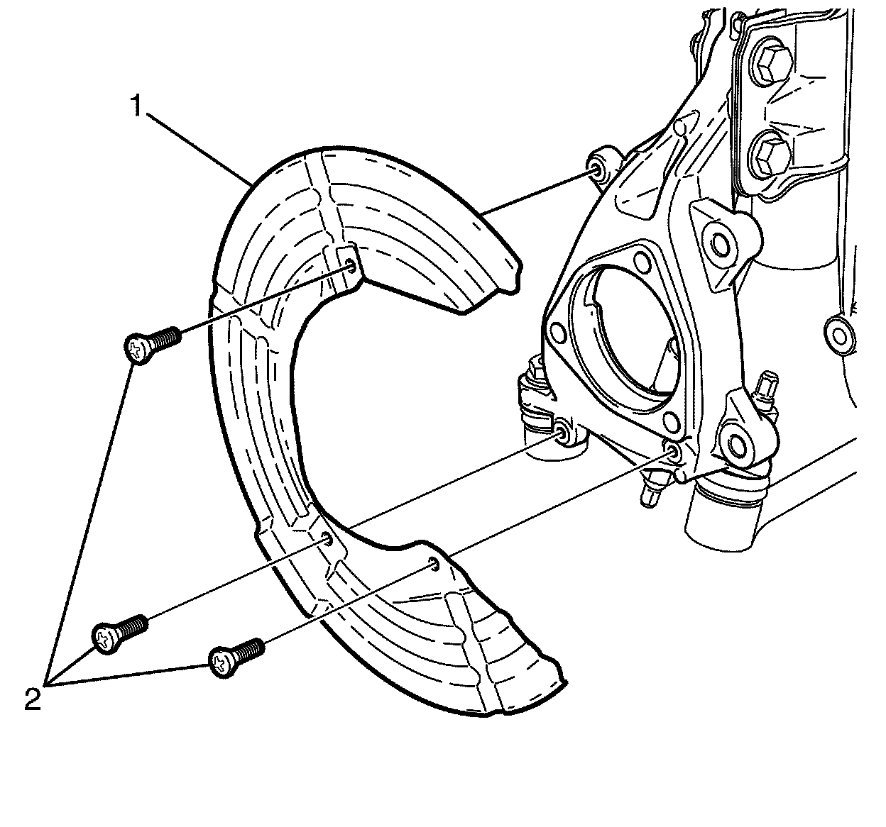 2. Install the brake disc splash shield to steering knuckle retaining bolts (2) and tighten to 9 Nm (89 lb in).